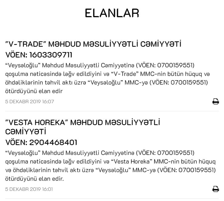 “V-Trade” MMC və “Vesta Horeka” MMC-nin “Veysəloğlu” MMC-yə qoşulduqları üçün ləğv edildikləri açıqlanıb.