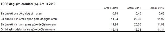 Türkiyədə istehlakçı qiymətləri indeksi ötən ilin Dekabr ayında 2018-ci ilin Dekabr ayı ilə müqayisədə 11.84% (illik inflyasiya), ötən ilin Noyabr ayı ilə müqayisədə isə 0.74% artıb (aylıq inflyasiya).