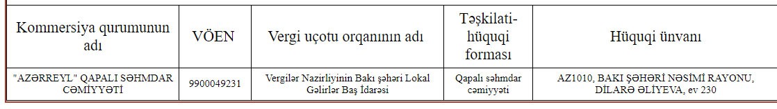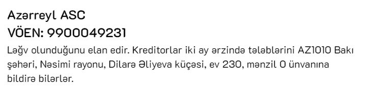 "Azərreyl" QSC ləğv olunduğunu elan edir.