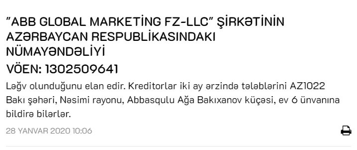 “Marja” xəbər verir ki, "ABB Global Marketing FZ-LLC" şirkəti Azərbaycan Respublikasındakı nümayəndəliyi ləğv olunduğunu elan edir. Kreditorlar iki ay ərzində tələblərini AZ1022 Bakı şəhəri, Nəsimi rayonu, Abbasqulu Ağa Bakıxanov küçəsi, ev 6 ünvanına bildirə bilərlər.