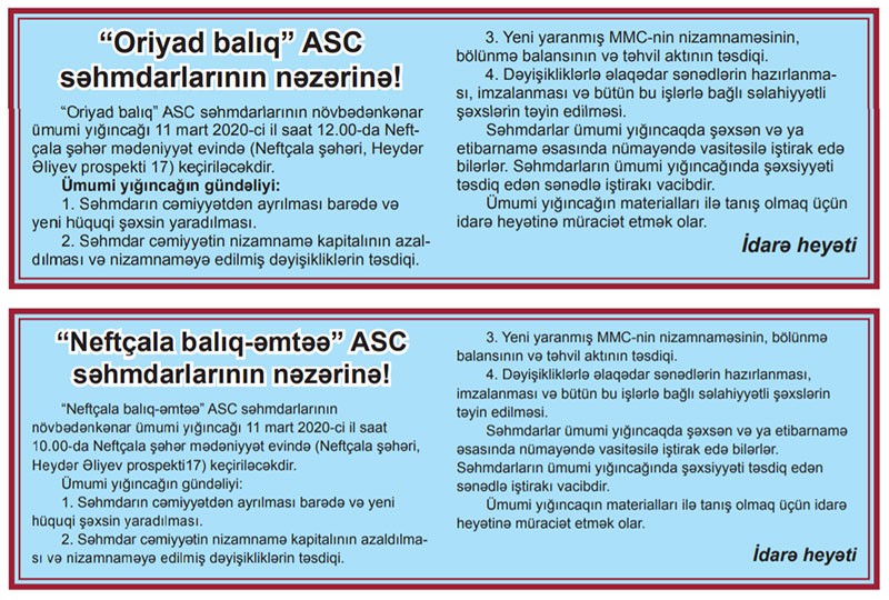 “Marja” xəbər verir ki, 11 mart 2020-ci il tarixində “Oriyad balıq” ASC və “Neftçala balıq-əmtəə” ASC səhmdarlarının növbədənkənar ümumi yığıncağı keçiriləcək.