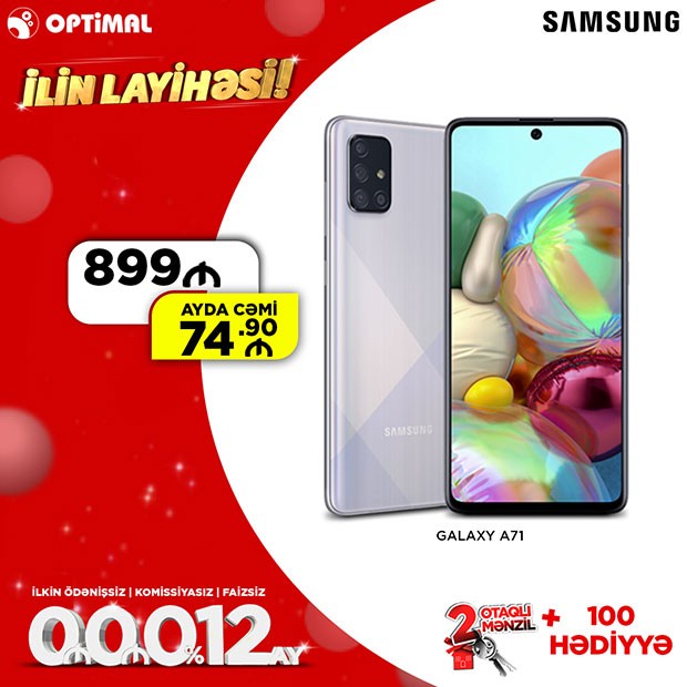 - Samsung Galaxy A71 (6/128 GB, dördlü kamera) modelinə ayda 74.90 azn,