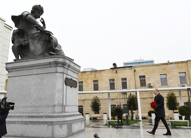 Dövlətimizin başçısı heykəlin önünə gül dəstələri qoydu.