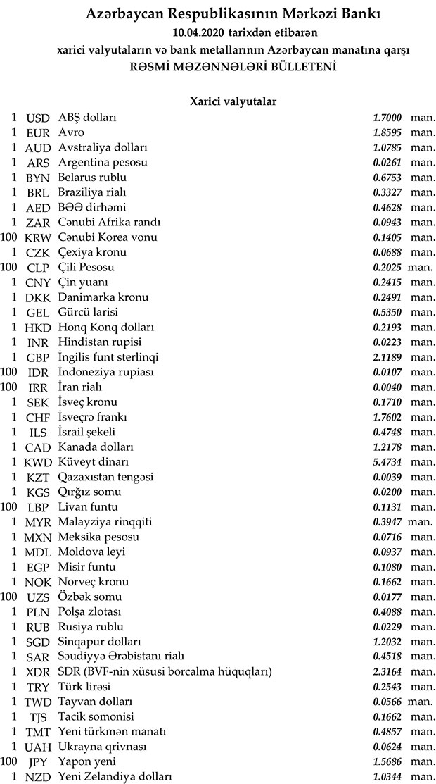 2020-ci ilin Aprel ayının 10-na Mərkəzi Bankın açıqladığı rəsmi Dollar/Manat məzənnəsi Aprelin 9-u ilə müqayisədə dəyişməyərək 1,7000 manatda qalıb, Avro/manat məzənnəsi 1.8595 manata, Rubl/manat məzənnəsi isə 0,0229 manata qalxıb.