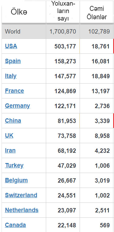 Dünyada koronavirusdan ölənlərin sayı 100 min səviyyəsini də aşaraq 102 min 789-a çatıb