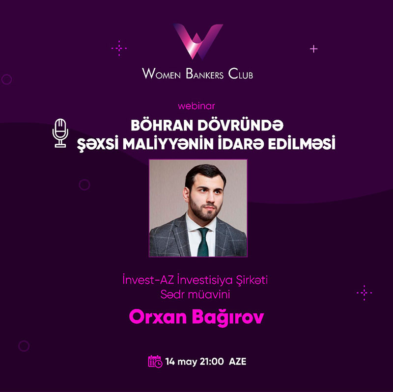 Bugün, 14 may 2020-ci il tarixində Women Bankers Club-ın növbəti qonağı “İnvest-AZ İnvestisiya Şirkəti” QSC-nin Sədr müavini Orxan Bağırovdur. O bizə böhran dövründə şəxsi maliyyənin idarə edilməsi mövzusunda danışacaqdır. Vebinarın sonunda siz eləcə də mövzu ilə bağlı suallarınızı canlı olaraq verə bilərsiniz.