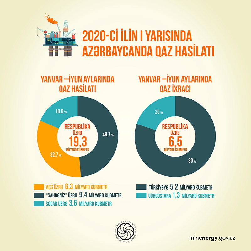 2020-ci ilin 6 ayı ərzində ötən ilin müvafiq dövrünə nisbətən 11 faizdən çox, yəni 2 milyard kubmetrə yaxın artımla 19,3 milyard kubmetr qaz hasil edilib. Qaz hasilatının 6,3 milyard kubmetri AÇG-dən, 9,4 milyard kubmetri isə “Şahdəniz”dən əldə edilib. SOCAR üzrə bu dövrdə 3,6 milyard kubmetr qaz hasil olunub.