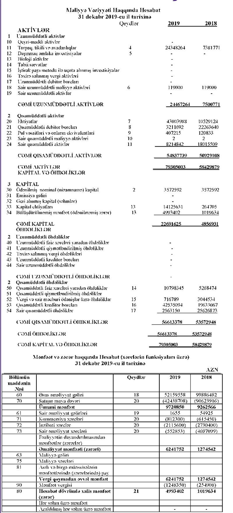 Satışın maya dəyəri xaric ötən il ümumi mənfəət 9 milyon 720 min manat təşkil edib. 2018-ci ildə bu məbləğ 9 milyon 262 min manat idi. 2018-ci ildə 4 milyon 697 min manat təşkil etmiş “sair əməliyyat xərcləri”nin 2019-cu ildə 553 min manat düşməsilə əlaqədar olaraq, əməliyyat mənfəəti təxminən 5 dəfə artaraq 6 milyon 241 min manat təşkil edib. Şirkət ötən il əməliyyat mənfəətindən 1 milyon 248 min manat mənfəət vergisi ödəyib.