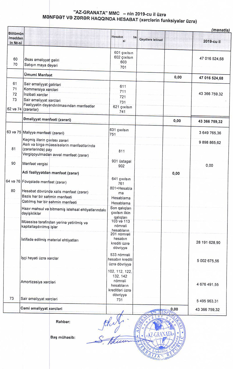 Müqayisə üçün qeyd edək ki, 2018-ci ildə "Az-Granata"nın cəmi gəlirləri 35 milyon 225 min manat, cəmi xərcləri 34 milyon 634 min manat təşkil etmiş, nəticədə 591 min manat balans mənfəəti formalaşmışdı. Lakin əvvəlki illərin (2013-2017) zərərləri nəzərə alınmaqla il 10 milyon 579 min manat zərər ilə yekunlaşmışdı.