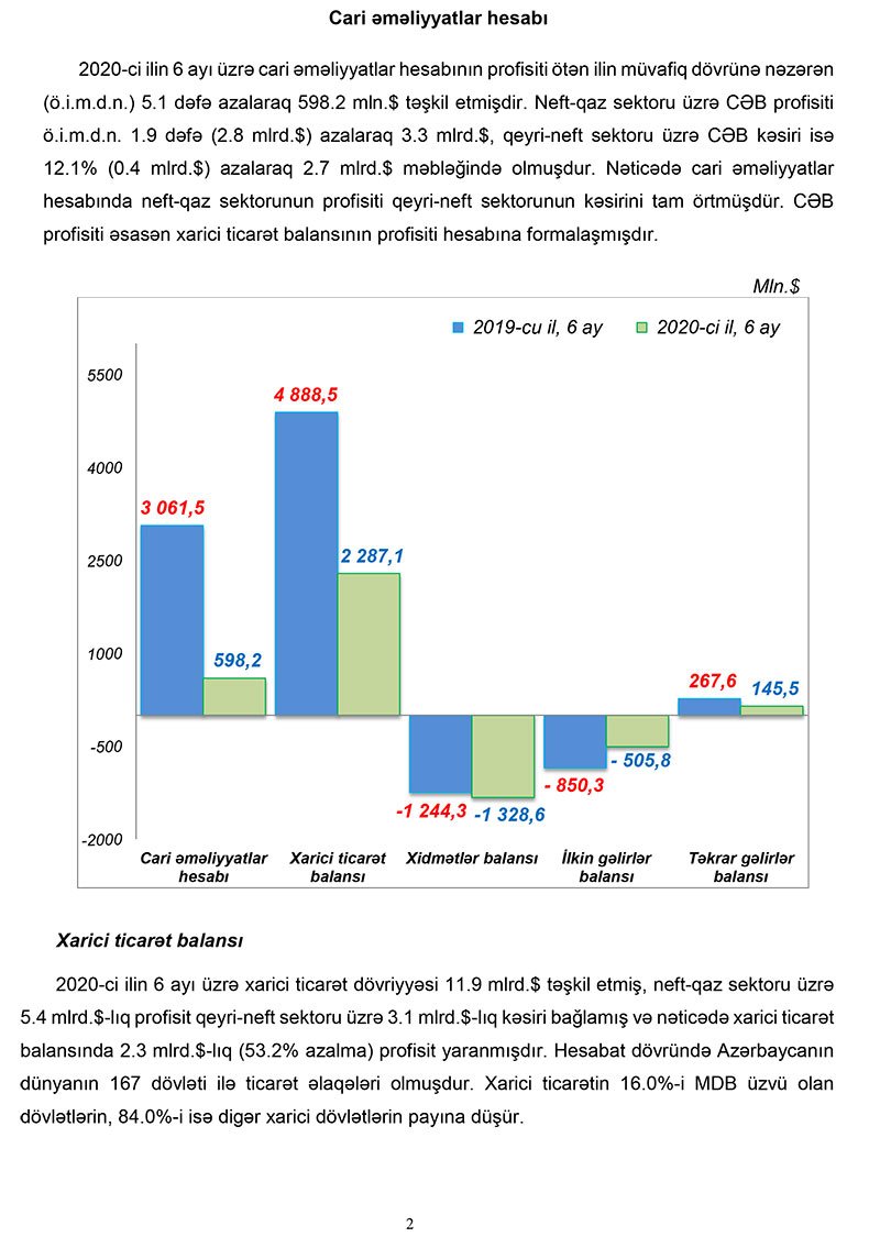 Cari əməliyyatlar hesabı 2020-ci ilin 6 ayı üzrə cari əməliyyatlar hesabının profisiti ötən ilin müvafiq dövrünə nəzərən 5.1 dəfə azalaraq 598.2 milyon dollar təşkil etmişdir. Neft-qaz sektoru üzrə CƏB profisiti ötən ilin müvafiq dövrünə nəzərən 1.9 dəfə (2.8 mlrd.dollar) azalaraq 3.3 mlrd.dollar, qeyri-neft sektoru üzrə CƏB kəsiri isə 12.1% (0.4 mlrd.dollar) azalaraq 2.7 mlrd. dollar məbləğində olmuşdur. Nəticədə cari əməliyyatlar hesabında neft-qaz sektorunun profisiti qeyri-neft sektorunun kəsirini tam örtmüşdür. CƏB profisiti əsasən xarici ticarət balansının profisiti hesabına formalaşmışdır.