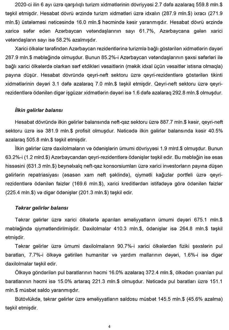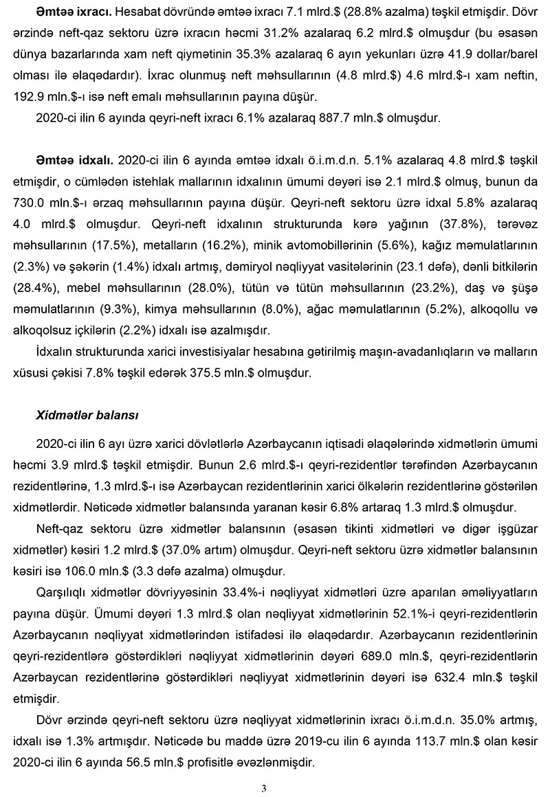 "Xarici mühitin əlverişsiz olduğu bir şəraitdə 2020-ci ilin 6 ayı üzrə tədiyə balansının1 əsas maddələri olan cari əməliyyatlar balansında (CƏB) 598.2 milyon dollar profisit, kapital və maliyyənin hərəkəti hesabında isə 956.4 milyon dollar kəsir yaranmış, ehtiyat aktivləri 957.5 milyon dollar azalmışdır. Bu dövrdə orta neft qiyməti 41.9 dollar/barel olmuş, qeyri-neft ixracı isə 6.1% azalmışdır“, - Mərkəzi Bankın məlumatında bildirilir.