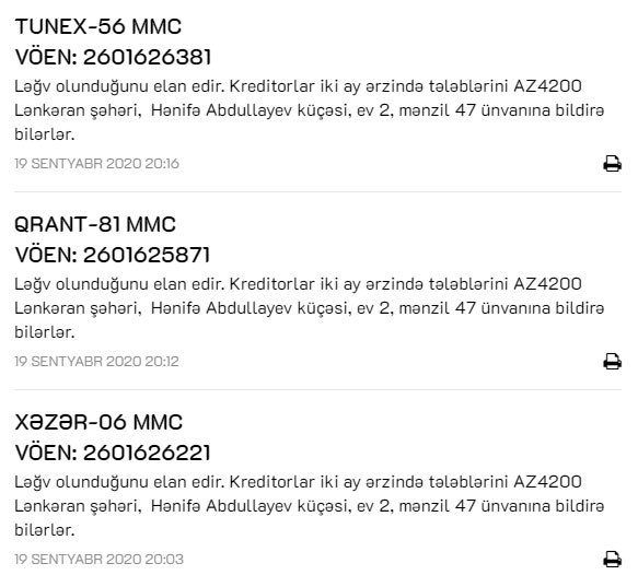 Azərbaycanda eyni hüquqi ünvanda dövlət qeydiyyatına alımış “Tunex-56”, “Qrant-81 və “Xəzər-06” MMC-lər ləğv olunduğunu elan edib.