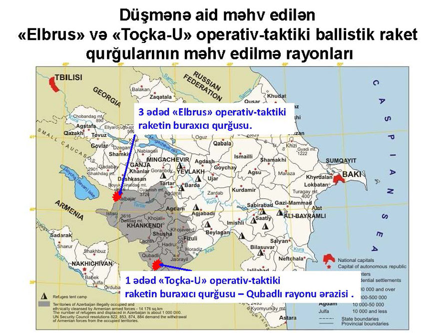 Beləliklə, ballistik raketlərə qarşı xüsusi əməliyyatların nəticəsində oktyabrın 12-də saat 14 radələrində işğal altındakı Qubadlı rayonu ərazisində bir ədəd “Toçka-U” raketi məhv edilib. Oktyabrın 14-də gecə saat 01 radələrində iki ədəd və səhər 08:30 radələrində bir ədəd olmaqla ümumilikdə üç ədəd “Elbrus” ballistik raket qurğusunun raketləri ilə birlikdə ordumuz tərəfindən aşkarlanaraq məhv edilib.