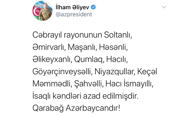 "Cəbrayıl rayonunun Soltanlı, Əmirvarlı, Maşanlı, Həsənli, Əlikeyxanlı, Qumlaq, Hacılı, Göyərçinveysəlli, Niyazqullar, Keçəl Məmmədli, Şahvəlli, Hacı İsmayıllı, İsaqlı kəndləri azad edilmişdir. Qarabağ Azərbaycandır!",- Azərbaycan Prezidenti İlham Əliyev Twiter səhifəsində bildirib.