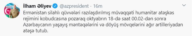 “Ermənistan silahlı qüvvələri razılaşdırılmış müvəqqəti humanitar atəşkəs rejimini kobudcasına pozaraq oktyabrın 18-də saat 00:02-dən sonra Azərbaycanın yaşayış məntəqələrini və döyüş mövqelərini ağır artilleriyadan atəşə tutub.