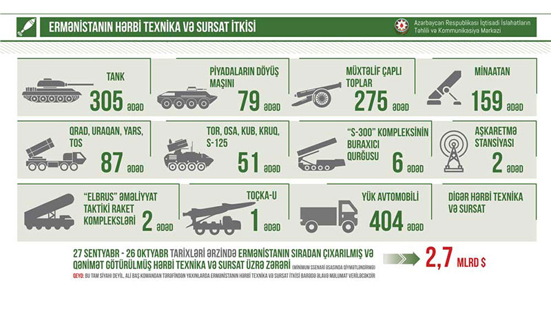 Kommunikasiya Departamenti İqtisadi İslahatların Təhlili və Kommunikasiya Mərkəzinin yaydığı məlumata görə, Belə ki, bu müddət ərzində Ermənistan ordusunun 252 tankı məhv edilib, 53 tankı qənimət kimi götürülüb. Ermənistan 79 ədəd piyadaların döyüş maşını, 275 müxtəlif çaplı top, 106 minaatan, 53 tank əleyhinə vasitədən məhrum edilib. 82 “Qrad” qurğusu, 2 “Uraqan” Yaylım Atəşli Raket Sistemi, bir “TOS” sistemi məhv edilib. Eyni zamanda 4 “TOR”, 40-a yaxın “OSA”, 4 “KUB”, bir ”KRUQ”, 2 “S-125” zenit-raket kompleksləri və qurğuları zərərsizləşdirilib. Həmçinin, 6 “S-300” atıcı qurğusu, bir aşkaretmə stansiyası, bir lokator, bir “Toçka-U”, 2 Elbrus əməliyyat taktiki raket kompleksləri məhv edilib. Əlavə olaraq, 20-i silah-sursatla dolu olan 231 yük avtomobili məhv edilib, 173 yük avtomobili isə hərbi qənimət kimi götürülüb. Qeyd edək ki, bu tam siyahı deyil, yaxınlarda Ermənistanın hərbi texnika və sursat itkisi barədə əlavə məlumat veriləcəkdir. Məhv edilən hərbi texnikanın içərisində Ermənistanın iqtisadi gücünün əldə etməyə heç bir imkan vermədiyi dəyəri yüz milyonlarla dollarla ölçülən S-300 sistemlərindən, satışı qadağan olunan ballistik “Elbrus” raket sistemlərinə qədər çoxnövlü silah arsenalına rast gəlinməsi Ermənistanın ötən 30 il ərzində qanunsuz silahlandırılmasına da aydınlıq gətirib.