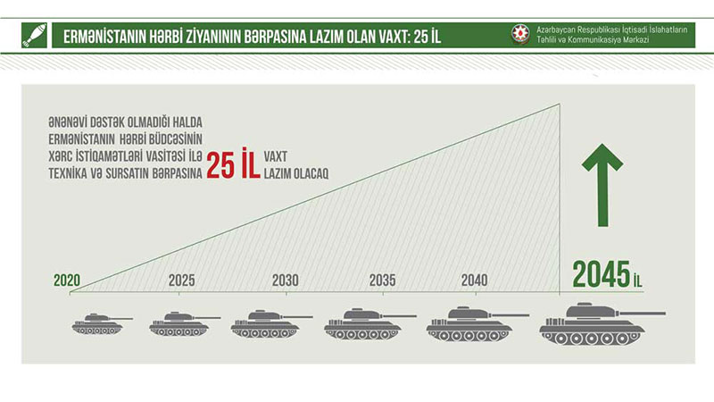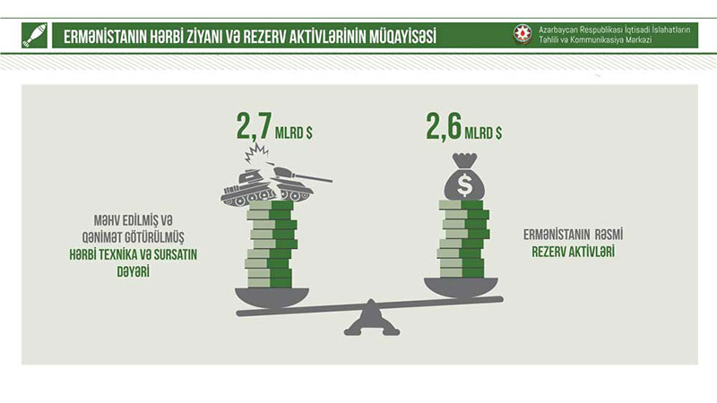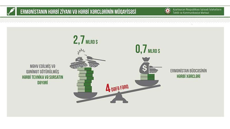 Cəmi bir ay ərzində Ermənistana vurulan hərbi ziyan bu ölkənin ümumi hərbi xərclərini 4 dəfə üstələyir. Ancaq 716 milyon ABŞ dolları civarında hərbi büdcəsi olan bir ölkənin milyardlarla dollar silah arsenalına sahib olması iqtisadi qanunauyğunluqlarla heç bir halda izah oluna bilməz. Belə ki, cəmi 2,6 milyard ABŞ dolları həcmində rezerv aktivləri olan Ermənistanın iqtisadi gücü bu silahları əldə etmək baxımından xeyli məhduddur. Digər tərəfdən bir aylıq müharibədə itirdiyi hərbi texnikanın miqdarı Ermənistanın silahlanmanın məhdudlaşdırılmasını nəzərdə tutan “Avropada Adi Silahlı Qüvvələr üzrə Saziş”in şərtlərini də pozduğunu və bu müqavilənin şərtlərinə uyğun olmayan həddə silah və hərbi texnika saxladığını ortaya çıxarıb.