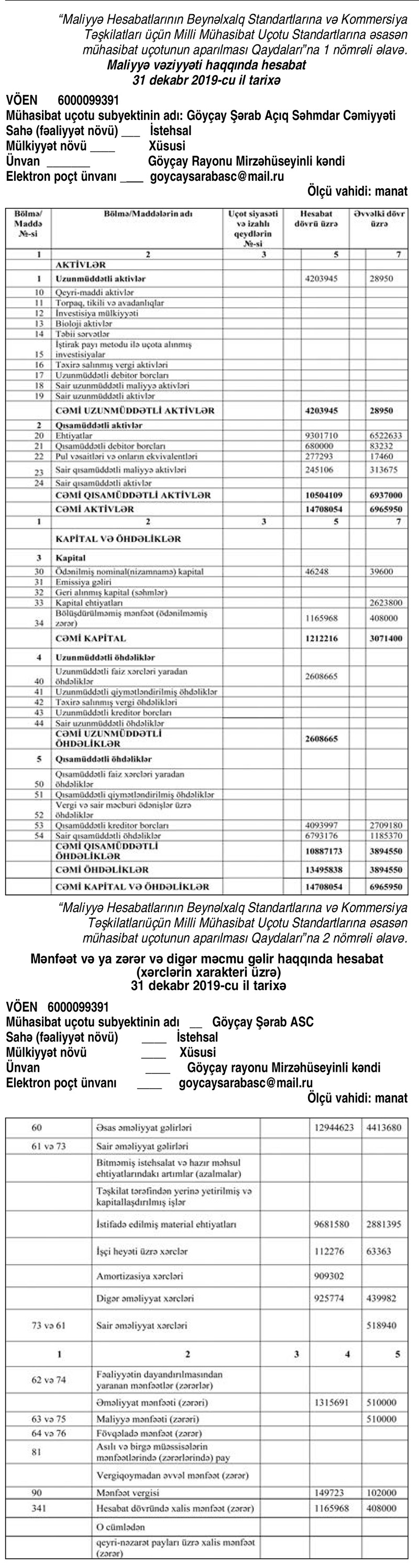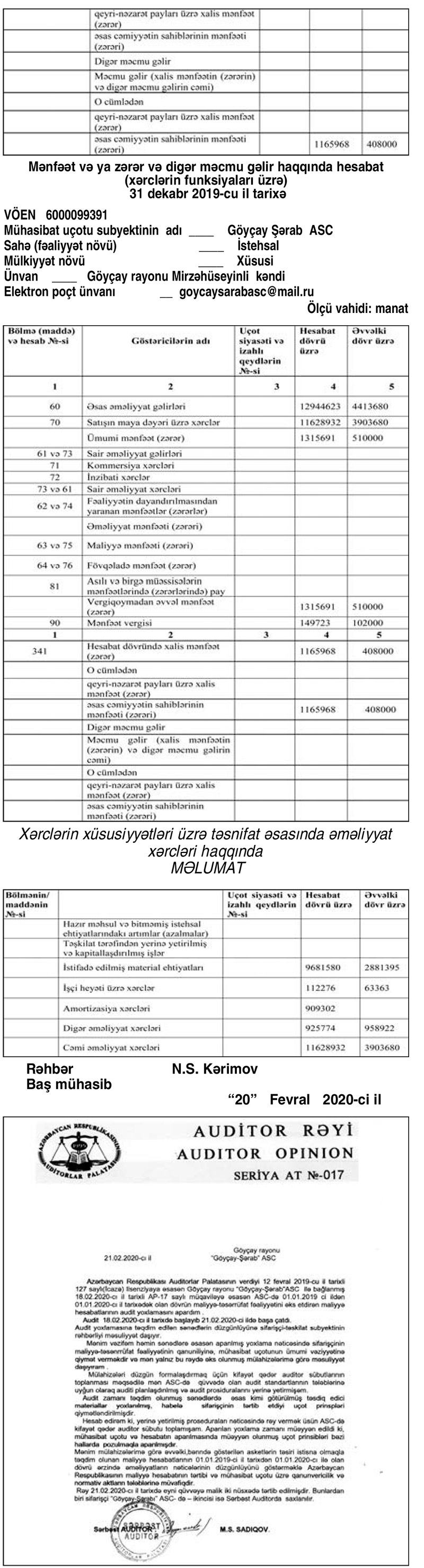 “Göyçay Şərab” ASC 2019-cu ili 1 milyon 165 min 958 manat xalis mənfəət ilə başa vurub. Bu, 2018-ci illə müqayisədə 2,8 dəfə çoxdur. ASC 2018-ci ili 408 min manat, 2017-ci ili isə 86 min 848 manat xalis mənfəət ilə bağlamışdı.