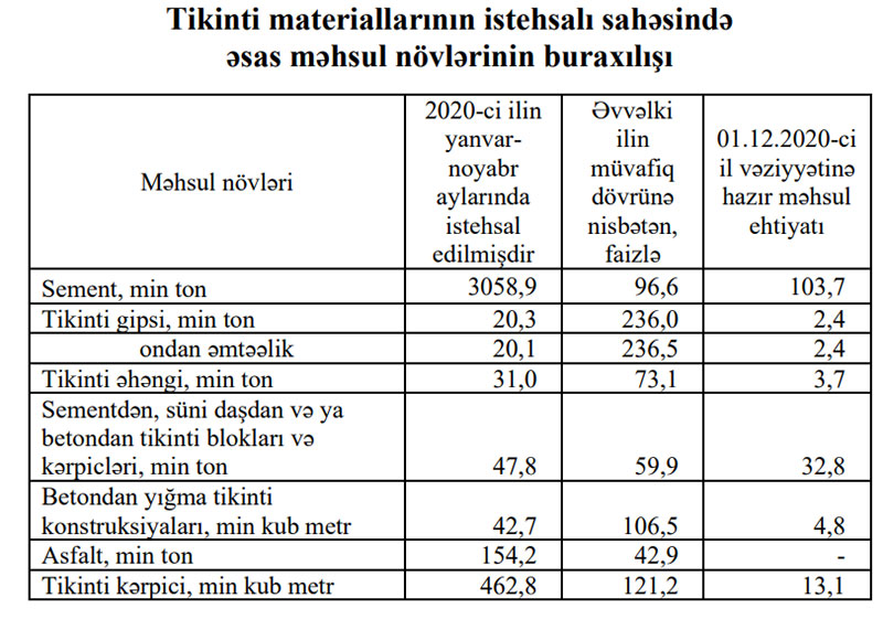 Ümumiyyətlə, tikinti materiallarının istehsalı sahəsində istehsalın ümumi dəyəri 660,8 milyon manat olmaqla, əvvəlki ilin müvafiq dövrü ilə müqayisədə 24,6 faiz artmışdır. Tikinti gipsinin istehsalı 2,4 dəfə, tikinti kərpicinin istehsalı 21,2 faiz, hörmə üçün hazır beton qarışığının istehsalı 11,0 faiz, betondan yığma tikinti konstruksiyalarının istehsalı isə 6,5 faiz artmış, tikinti əhənginin istehsalı 26,9 faiz, emal edilmiş mərmər, travertin, alebastr və onlardan məmulatların istehsalı 35,3 faiz, sementdən, süni daşdan və ya betondan tikinti blokları və kərpiclərinin istehsalı 40,1 faiz, asfaltın istehsalı isə 57,1 faiz azalmışdır.