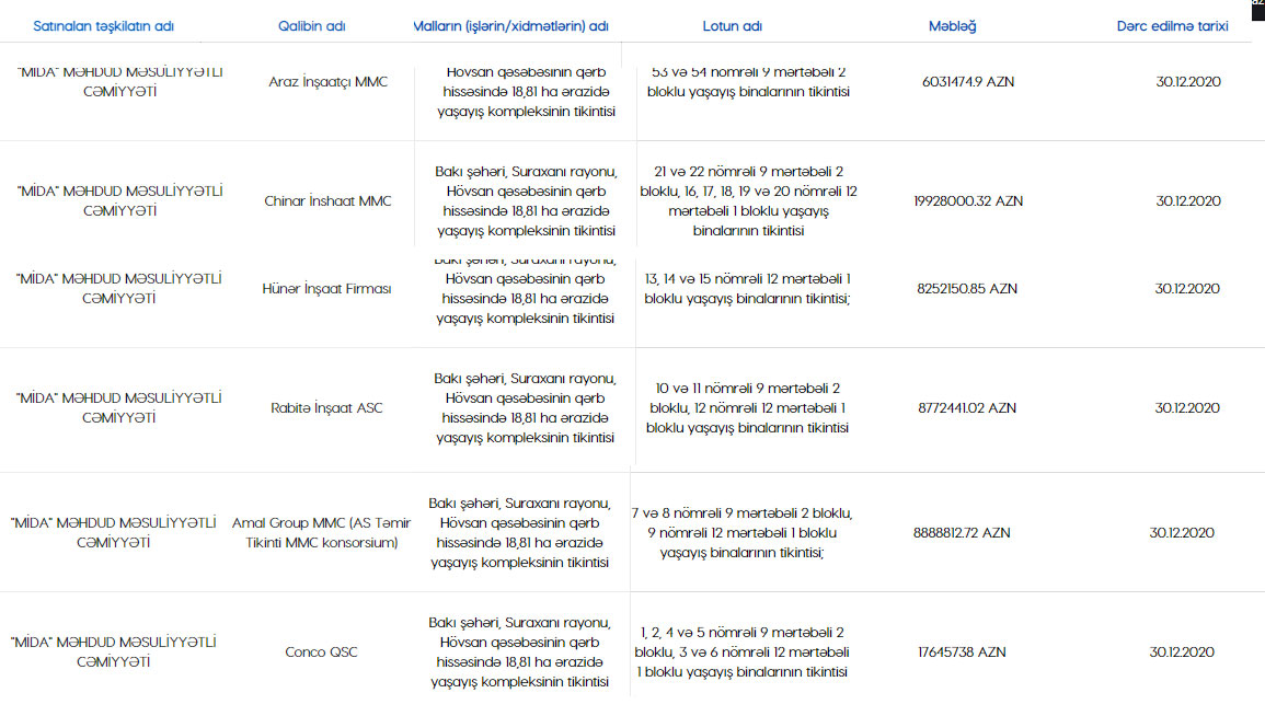 Azərbaycan Respublikasının Mənzil İnşaatı Dövlət Agentliyinə tabe olan "MİDA" MMC Bakı şəhəri, Suraxanı rayonu, Hövsan qəsəbəsinin qərb hissəsində 18,81 ha ərazidə yaşayış kompleksinin tikintisi üzrə cəmi məbləği 69 milyon 518 min manat olan 6 müqavilə imzalayıb.