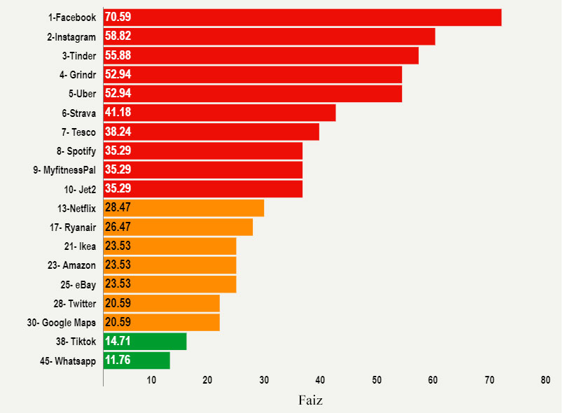 Facebook 1-ci, Whatsapp 45-inci yerdədir.İnternet təhlükəsizliyi mövzusunda araşdırmalar aparan müstəqil təşkilat Cladio, aralarında Facebook, Instagram, Twitter, Whatsapp, Google Maps, Air Bnb, Spotify, Tinder, Uber, Tiktok, Amazon, Ikea, Paypal və Netflix kimi şirkətlərin ağıllı telefon tətbiqlərində (proqramlarında) və internet saytlarında istifadəçidən tələb edilən məlumatlar mövzusunda əhatəli bir siyahı hazırlayıb.