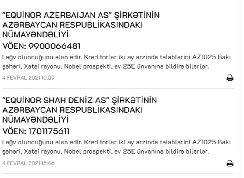 "EQUİNOR AZERBAIJAN AS" şirkətinin Azərbaycan Respublikasındakı nümayəndəliyi və "EQUİNOR SHAH DENİZ AS" şirkətinin Azərbaycan Respublikasındakı nümayəndəliyi ləğv edilir.
