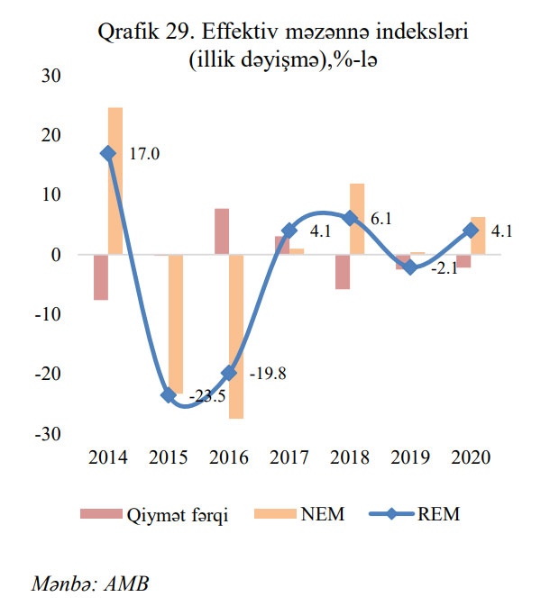 “2020-ci il ərzində manatın qeyri-neft ümumi ticarət çəkili nominal effektiv məzənnəsi (NEM) 6.3%, real effektiv məzənnəsi (REM) isə 4.1% bahalaşmışdır. Qeyd edək ki, 2014-cü ilin sonu ilə müqayisədə REM 30.9% ucuzlaşmışdır ki, bu da qeyri neft-qaz sektorunun uzunmüddətli rəqabət qabiliyyətinə müsbət təsir göstərən amillərdəndir”,- İcmalda deyilir.