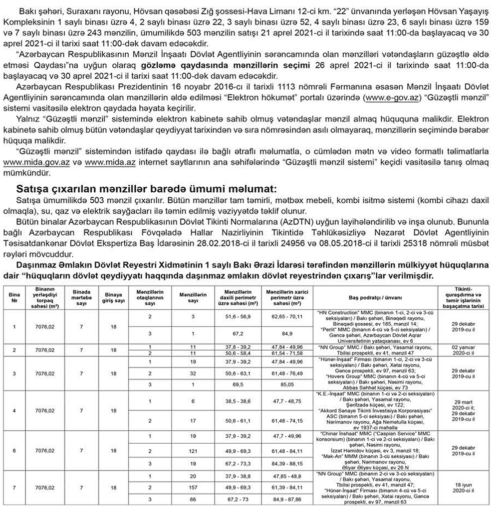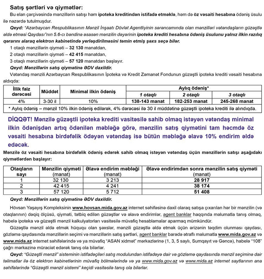 Azərbaycan Respublikasının Mənzil İnşaatı Dövlət Agentliyinin növbəti layihəsi – Hövsan Yaşayış Kompleksində mənzillərin güzəştlə satışı barədə elan verildiMənzil İnşaatı Dövlət Agentliyi (MİDA) Hövsan Yaşayış Kompleksindəki növbəti mənzilləri güzəştli satışa çıxarıb.
