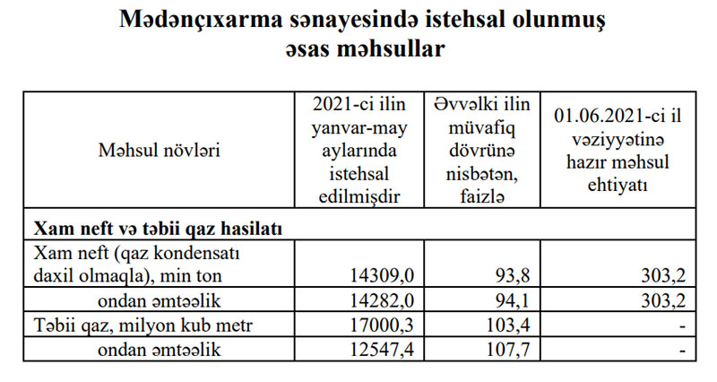 Marja Dövlət Statistika Komitəsinin aylıq hesabatına istinadən xəbər verir ki, sahənin əsas məhsulu olan əmtəəlik xam neft hasilatı 14,3 milyon ton, əmtəəlik təbii qaz hasilatı isə 12,5 milyard kub metr təşkil etmişdir.