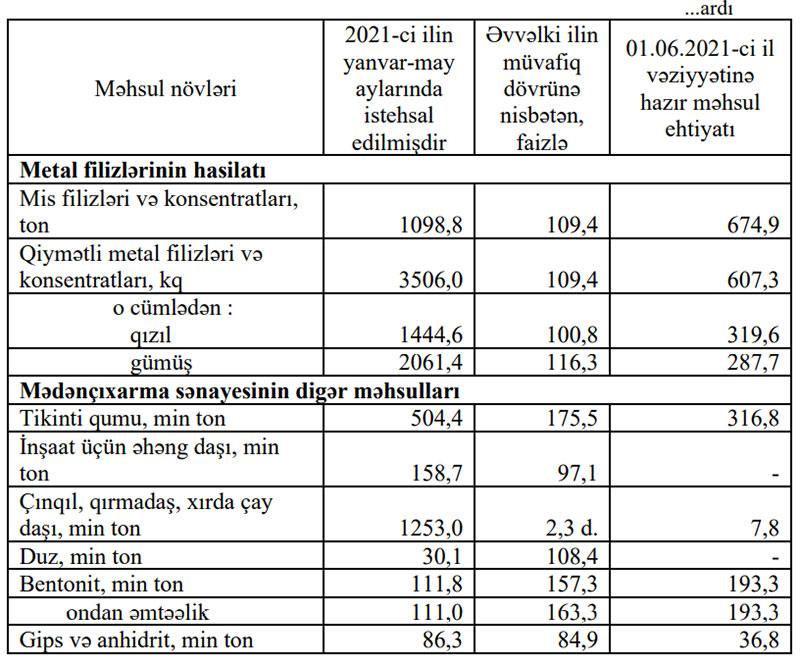 Mədənçıxarma sənayesində istehsalın ümumi dəyəri 11,8 milyard manat olmaqla, əvvəlki ilin yanvar-may aylarına nisbətən 5,6 faiz azalmışdır.