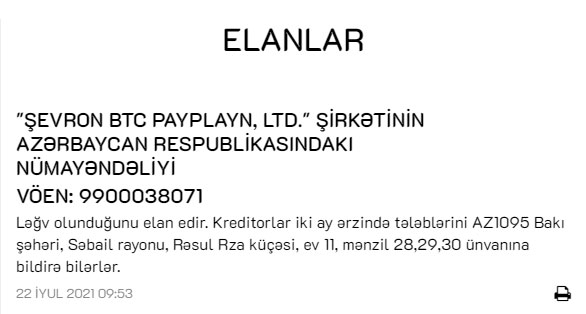 ““Chevron BTC Pipeline” şirkətinin ləğvi ilə əlaqədar kreditorların tələbləri iki ay ərzində Bakı şəhəri, Səbail rayonu, Rəsul Rza küçəsi, ev 11, mənzil 28, 29, 30 ünvanında qəbul olunur”, - deyə məlumatda bildirilir.