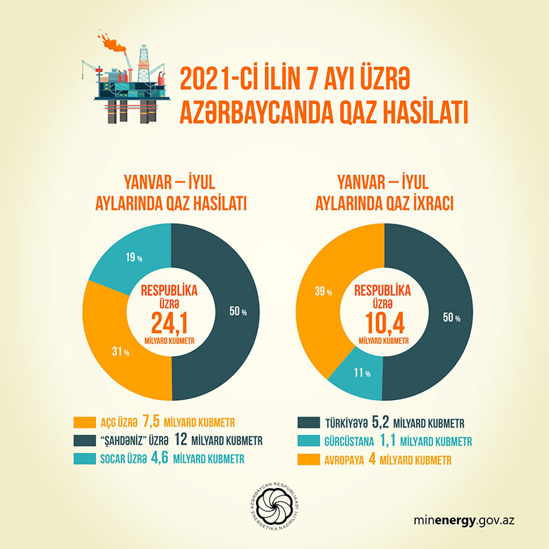 Cari ilin yanvar-iyul aylarında ölkədə 24,1 milyard kub metr qaz hasil edilib. Qazın 7,5 milyard kub metri AÇG-dən, 12 milyard kub metri “Şahdəniz”dən, 4,6 milyard kub metri SOCAR üzrə hasil olunub. Ötən ilin müvafiq dövrünə nisbətən 7,8 faiz, yəni 1,7 milyard kub metr artımla qaz hasil edilib.