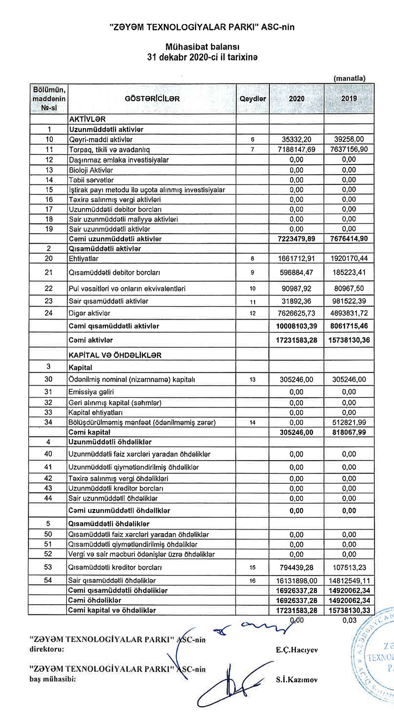 31 Dekabr 2020-ci il tarixində “Zəyəm Texnologiyalar Parkı” 17 milyon 231 min manat cəmi aktivlərə malik olub. ASC 2019-cu ilin sonunda 15 milyon 738 min manat cəmi akativlərə malik idi.