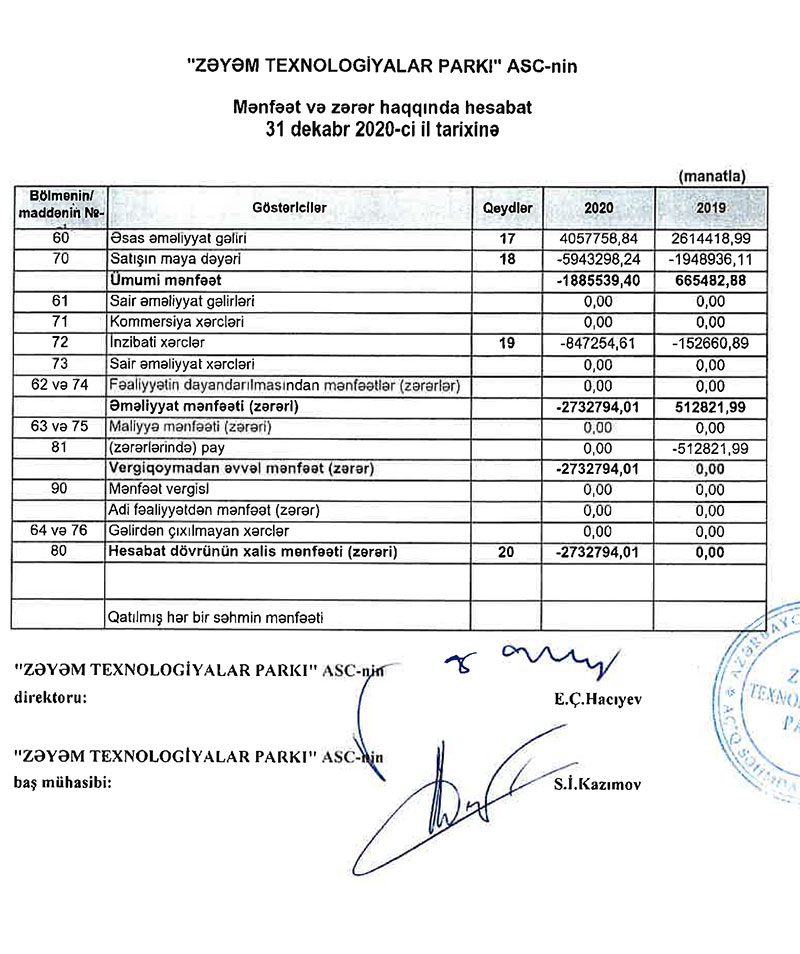 Xərclər artdığından “Zəyəm Texnologiyalar Parkı” 2020-ci ili 2 milyon 733 min manat xalis zərər ilə bağlayıb. Şirkət 2019-cu ili 513 min manat xalis mənfəət ilə bağlamışdı.