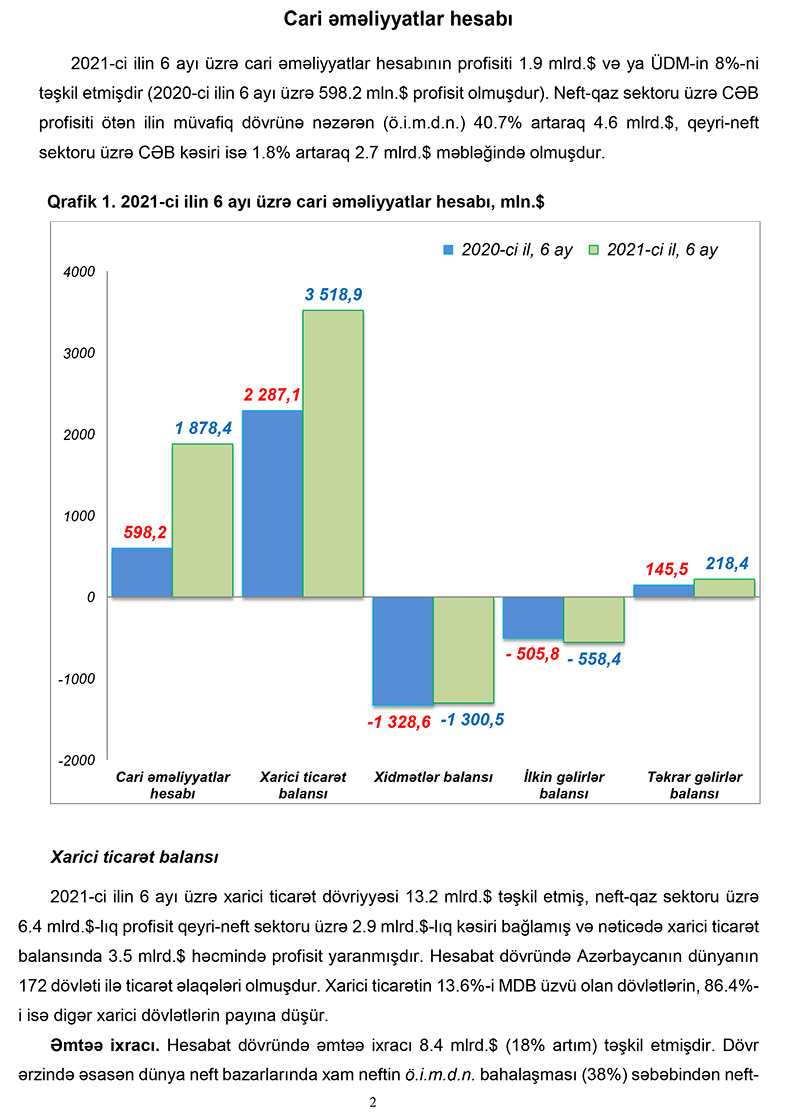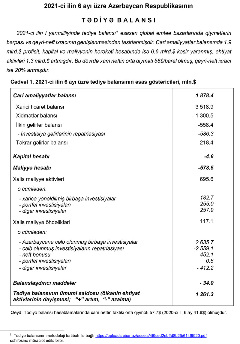 2021-ci ilin 1-ci yarımilliyində Azərbaycanın tədiyyə balansında 1,3 milyard dollar artıqlıq (profisit) yaranıb. Halbuki, 2020-ci ilin eyni dövründə 956,4 milyon dollar kəsir yaranmışdı.