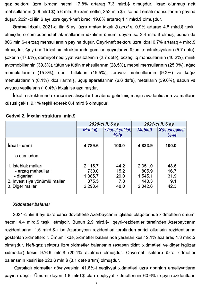 2021-ci ilin 6 ayı üzrə xarici dövlətlərlə Azərbaycanın iqtisadi əlaqələrində xidmətlərin ümumi həcmi 4.4 milyard dollar təşkil etmişdir. Bunun 2.9 milyard dolları qeyri-rezidentlər tərəfindən Azərbaycanın rezidentlərinə, 1.5 milyard dolları isə Azərbaycan rezidentləri tərəfindən xarici ölkələrin rezidentlərinə göstərilən xidmətlərdir. Ümumilikdə, xidmətlər balansında yaranan kəsir 2.1% azalaraq 1.3 milyard dollar olmuşdur. Neft-qaz sektoru üzrə xidmətlər balansının (əsasən tikinti xidmətləri və digər işgüzar xidmətlər) kəsiri 976.9 milyon dollar (20.1% azalma) olmuşdur. Qeyri-neft sektoru üzrə xidmətlər balansının kəsiri isə 323.6 milyon dollar (3.1 dəfə artım) olmuşdur.