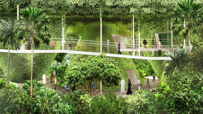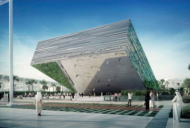 Sərginin 3 ən iri pavilyonu ziyarətçiləri Britaniyalı memar Asif Xanın ərəb Məşrabiyyə memarlıq üslubunda dizayn etdiyi 21 metr hündürlüyündə karbon-fiber toxuma qapılar vasitəsilə qəbul edəcək.