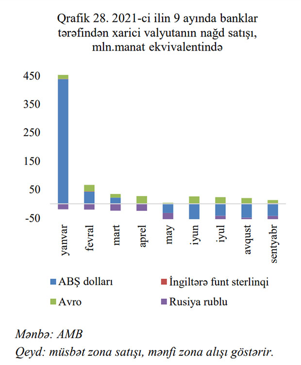 Qeyd edilib ki, nağdsız valyuta əməliyyatlarının 85.9%-i ABŞ dollarında, 14.1%-i isə digər valyutalarda aparılmışdır. Valyuta əməliyyatlarının 28.7%-i banklararası valyuta bazarında (BVB), 71.3%-i isə bankdaxili valyuta bazarında (BDVB) həyata keçirilmişdir.