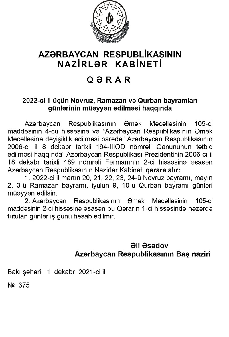 Marja.az-ın məlumatına görə, Nazirlər Kabinetinin “2022-ci il üçün Novruz, Ramazan və Qurban bayramları günlərinin müəyyən edilməsi haqqında” qərarına əsasən, 2022-ci il martın 20, 21, 22, 23, 24-ü Novruz bayramıdır.