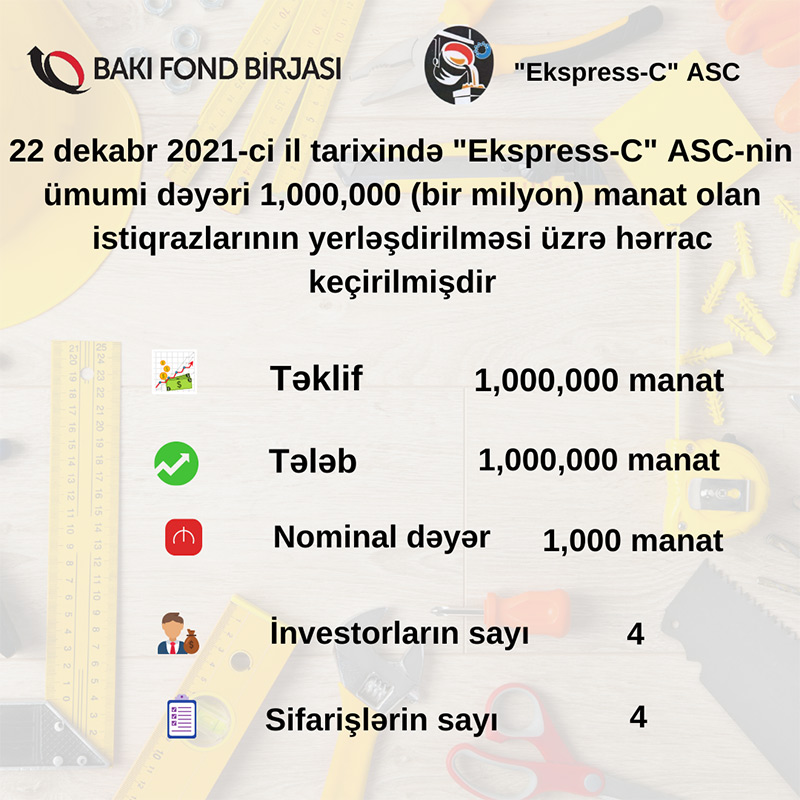 22 dekabr 2021-ci il tarixində Bakı Fond Birjasında "Ekspress-C" ASC-nin tədavül müddəti 2 (iki) təqvim ili olan AZ2002023607 dövlət qeydiyyat nömrəli, 1 milyon manat həcmində, faizli, təmin edilməmiş sənədsiz, adlı istiqrazlarının yerləşdirilməsi üzrə hərrac yekunlaşıb.
