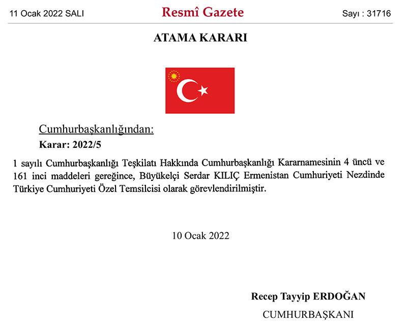 Serdar Kılıç Türkiyə Respublikasının Ermənistan Respublikasındakı xüsusi nümayəndəsi təyin edilib.