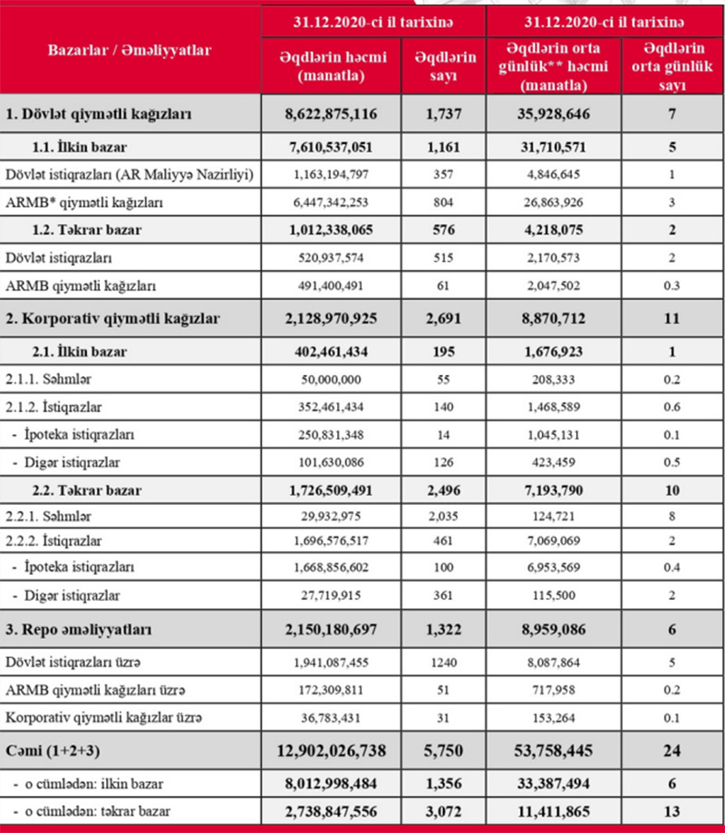 Ötən il dövlət istiqrazları ilə repo əməliyyatlarının həcmi 3,5 dəfə artaraq 6 milyard 834 milyon 180 min manat təşkil edib. 2020-ci ildə dövlət istiqrazları ilə repo əməliyyatlarının həcmi 1 milyard 941 milyon 87 min manat olmuşdu.