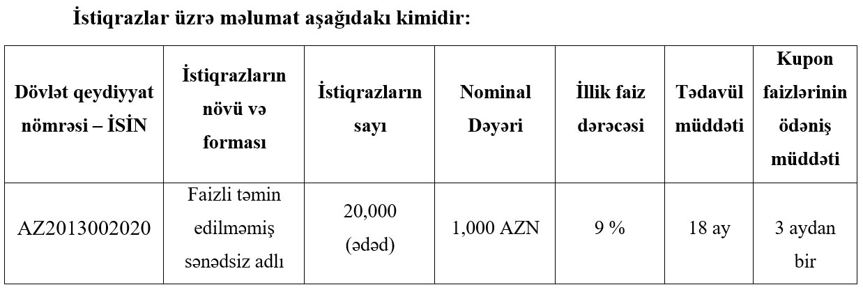 Marja Birjaya istinadən xəbər verir ki, faizli təmin edilməmiş sənədsiz adlı istiqrazların sayı 20 min ədəd, hər birinin nominal dəyəri 1000 manat, illik faiz dərəcəsi 9%, tədavül müddəti 18 ay, faizlərin ödəniş müddəti 3 aydan birdir.