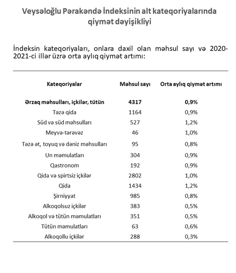 “Veysəloğlu Pərakəndə İndeksi”nə görə, məhsulların qiymətində 2020-ci ilin yanvar-dekabr aylarına nisbətən 2021-ci ilin yanvar-dekabr aylarında orta hesabla 6,3% artım müşahidə olunub.
