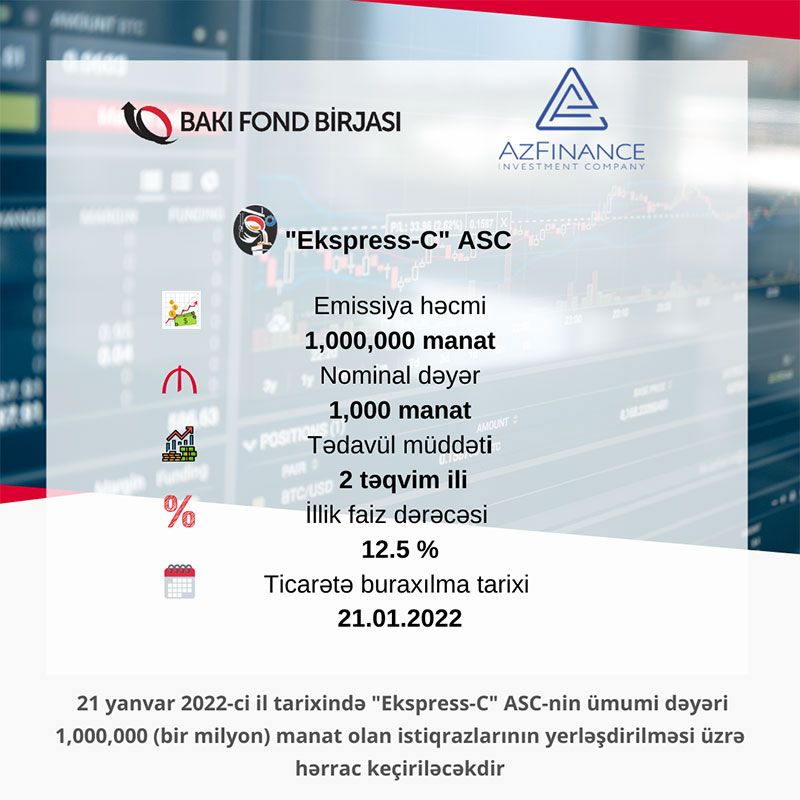 Birjanın yaydığı məlumata görə, 21 yanvar 2022-ci il tarixində "Ekspress-C" ASC-nin istiqrazlarının yerləşdirilməsi Bakı Fond Birjasında birqiymətli hərrac üsulu ilə həyata keçiriləcəkdir.