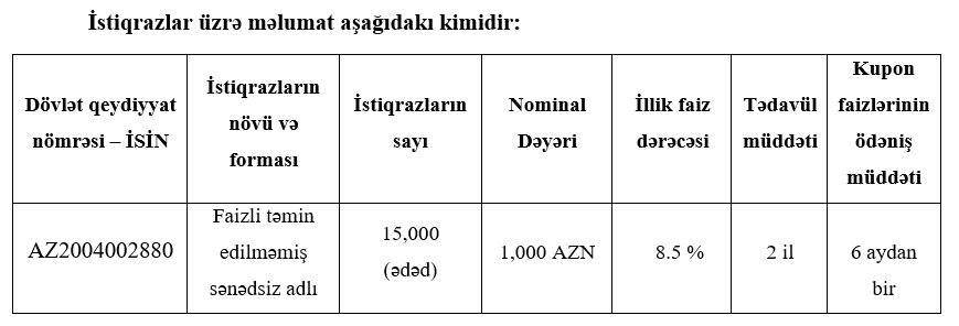 Marja Birja-ya istinadən xəbər verir ki, faizli təmin edilməmiş sənədsiz adlı istiqrazların sayı 15 min ədəd, hər birinin nominal dəyəri 1 000 manat, illik faiz dərəcəsi 8,5%, faizlərin ödəniş müddəti 6 aydan bir, tədavül müddəti 2 ildir.