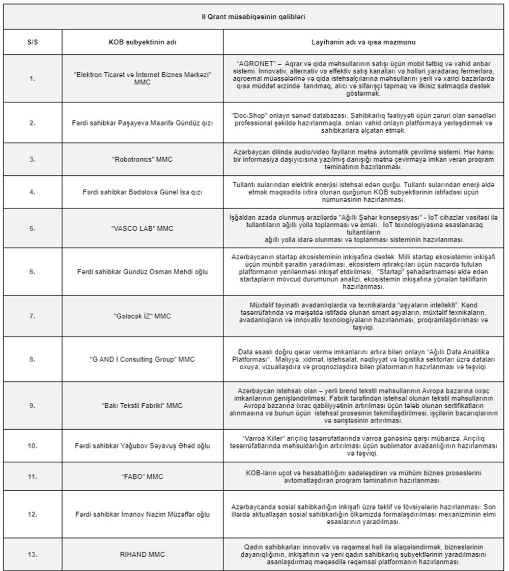 Qalib layihələr barədə ətraflı məlumatı KOBİA-nın saytından əldə etmək olar:https://smb.gov.az/az/nav/qrant