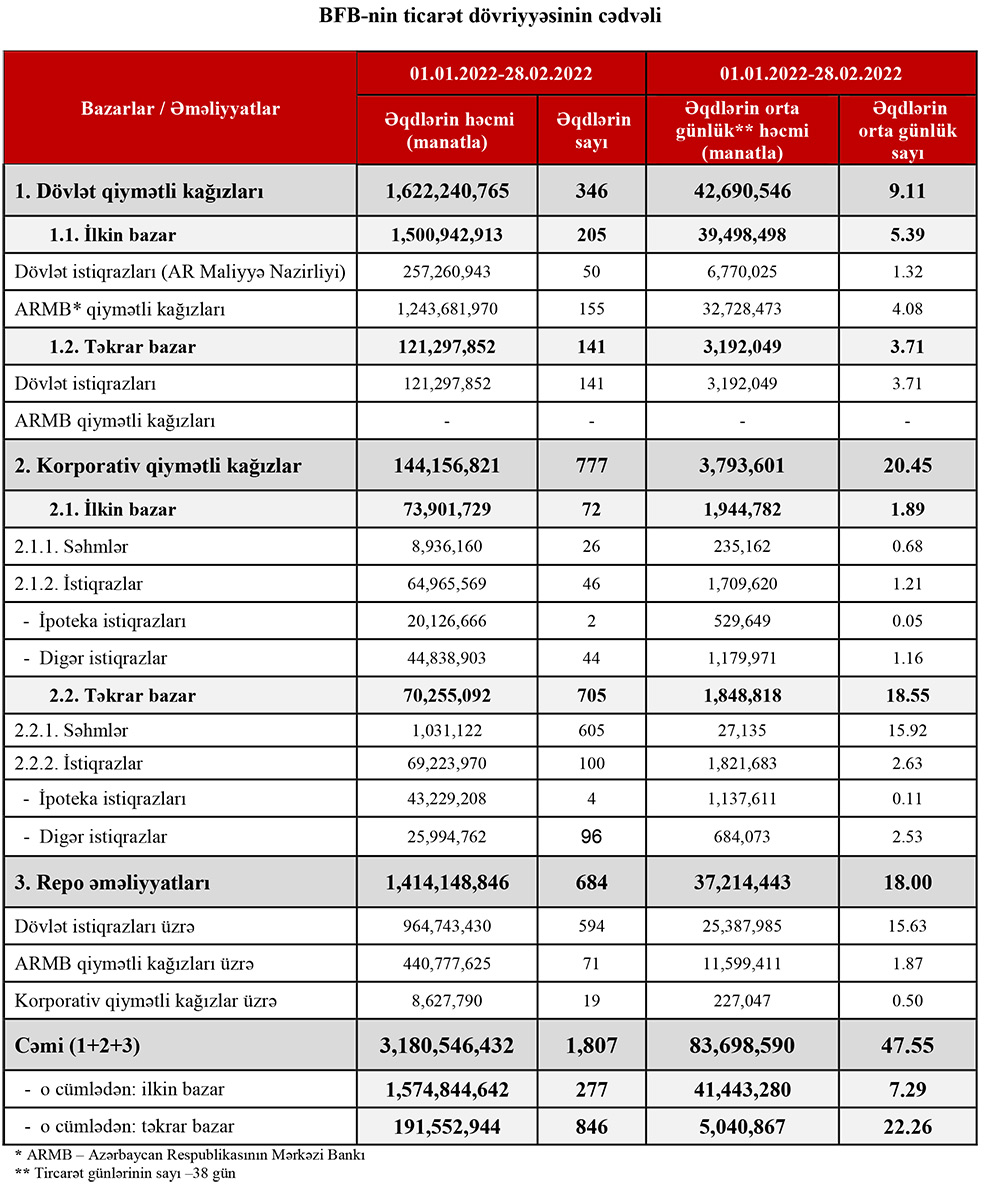 2022-ci ilin yanvar-fevral dövründə Bakı Fond Birjasında qiymətli kağızlar üzrə keçirilən əməliyyatların ümumi həcmi 3 milyard 180 milyon 546 minmanat təşkil etmişdir.