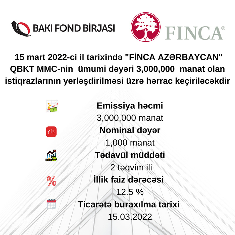 Birjanın yaydığı məlumata görə, 15 mart 2022-ci il tarixində "FİNCA AZƏRBAYCAN" QBKT MMC-nin istiqrazlarının yerləşdirilməsi Bakı Fond Birjasında birqiymətli hərrac üsulu ilə həyata keçiriləcəkdir.