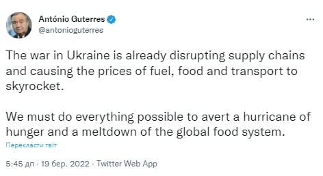 BMT-nin baş katibi Ukraynadakı müharibə səbəbindən kütləvi qıtlığın və dünyada qida sisteminin dağılacağını proqnozlaşdırır.